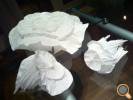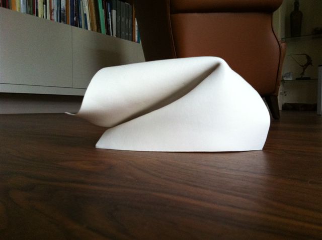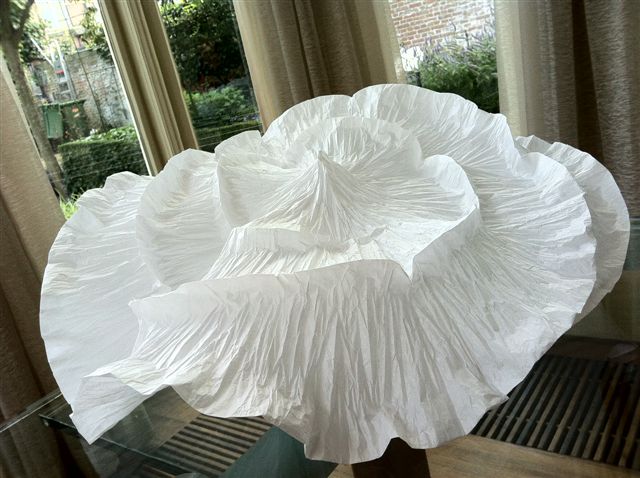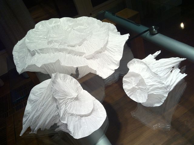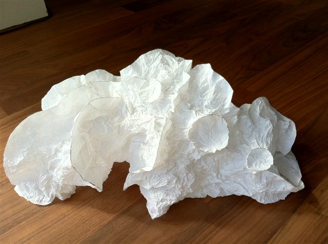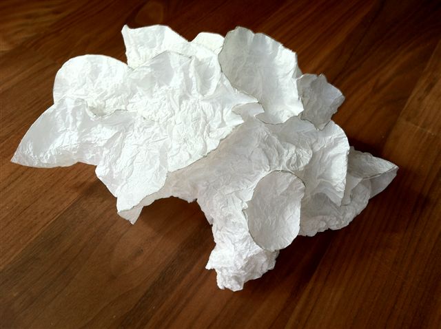 Sinds kort heb ik papier ‘ontdekt’ als middel om mee te experimenteren. Hieruit zijn zowel heel strakke, als ook de altijd weer in mijn werk terugkerende koraalvormen ontstaan. Inmiddels heb ik een aantal van deze vormen weer 'vertaald' in porselein.