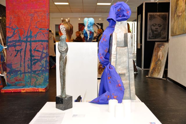 Op 28 april werd bij DADS een expositie geopend in het kader van 'Meimaand - Mariamaand'. Mijn inbreng  is een gevilte Mariamantel, vervaardigd van merinowol in combinatie met op een speciale manier bewerkte zijde. Deze mantel heb ik gevormd als vrouwenfiguur, zittend op een troon van keramiek. Collega kunstenaar Marjo Smits maakte deze zetel. Dit werk is nog te zien tot eind juli bij DADS, Lange Putstraat 10 in 's-Hertogenbosch. Daar zijn momenteel ook enkele nieuwe sjaals in vilt te zien en te koop, evenals een nieuw model hoed. En tenslotte vind je er ook mijn laatste werken in porselein.