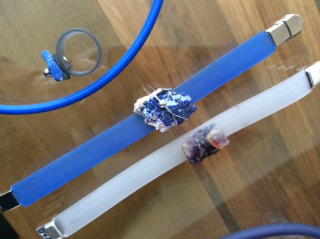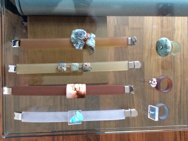 Via sieraden van RVS, vilt en porselein werk ik momenteel aan sieraden van rubber met halfedelstenen, mineralen, glas en perspex; dit laatste materiaal bewerkt door Ad van Amelsfort: