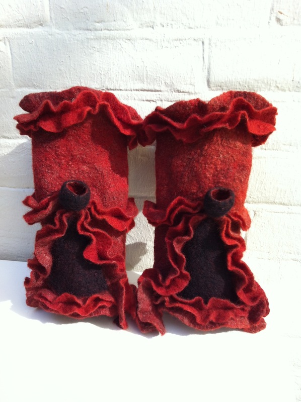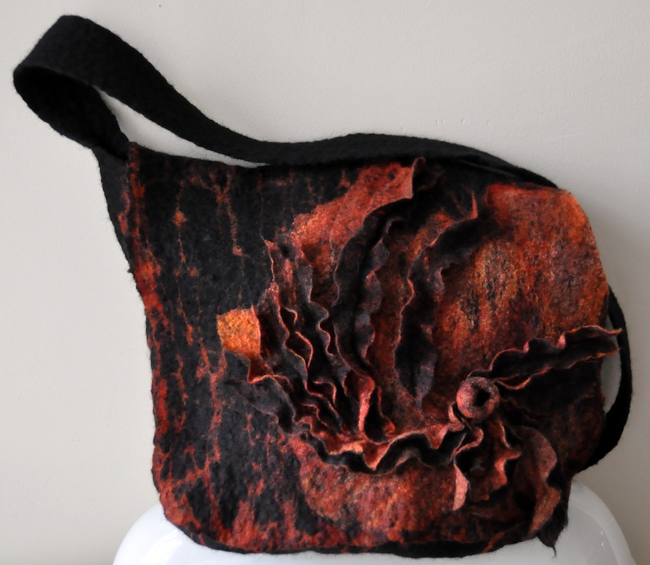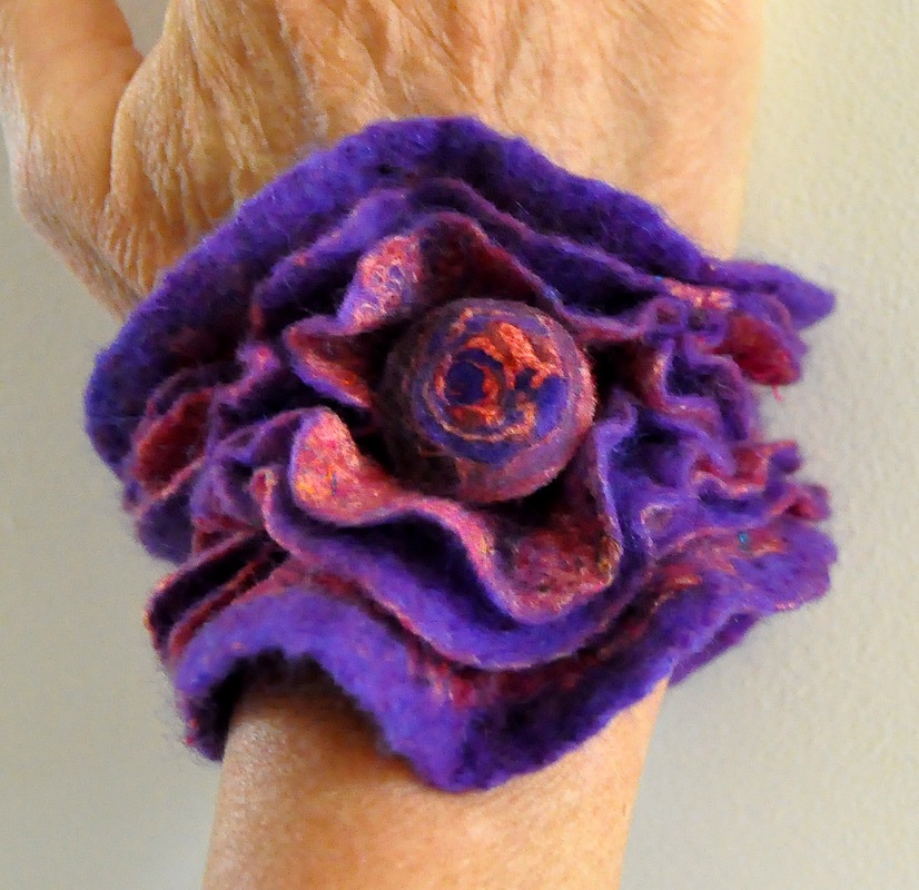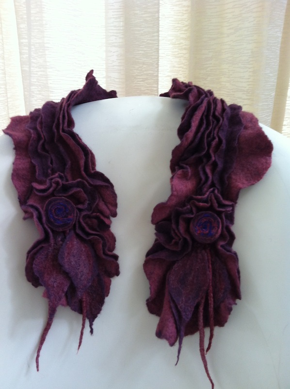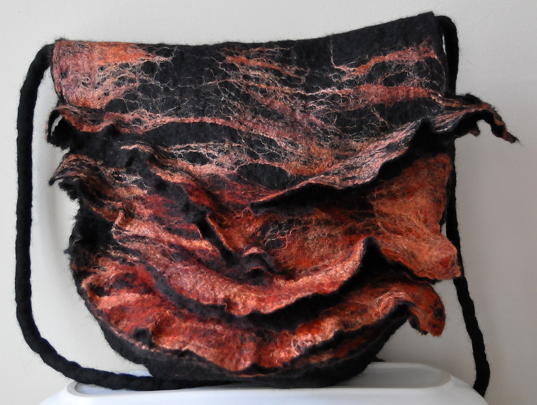 Ik vilt enkele verschillend gekleurde lagen wol op elkaar en maak uiteindelijk de onderliggende lagen weer gedeeltelijk zichtbaar door het op sommige plekken openzetten van de bovenste laag. Voor het resultaat: