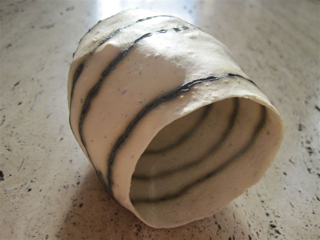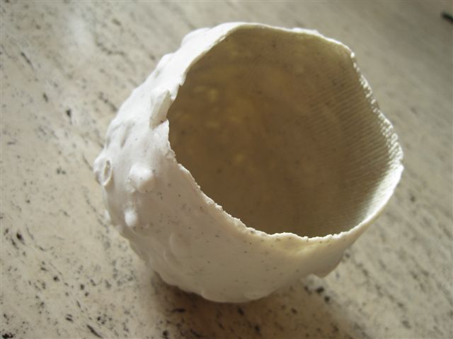 De afgelopen weken heb ik wat geëxperimenteerd met vloeibare porselein, waaraan ik papierpulp heb toegevoegd. Door deze toevoeging wordt porselein beter bewerkbaar en geeft minder krimp dan zonder papiertoevoeging. Als het porseleinen voorwerp al is gedroogd en je wilt het alsnog bewerken, dan kan dat door het te bevochtigen.