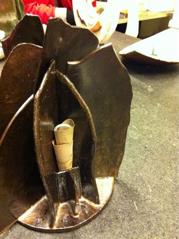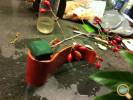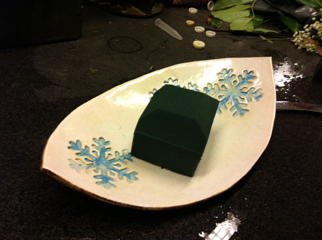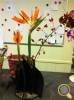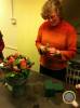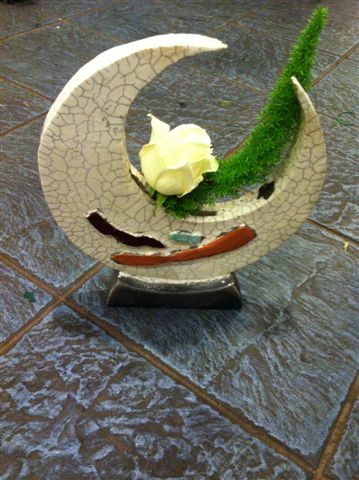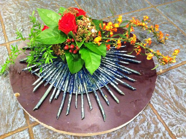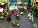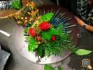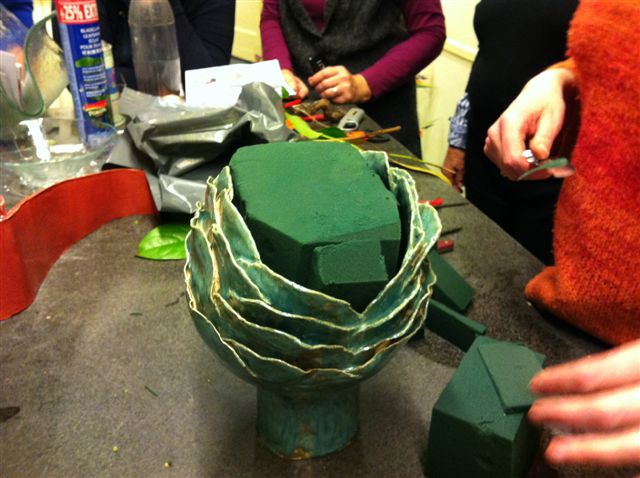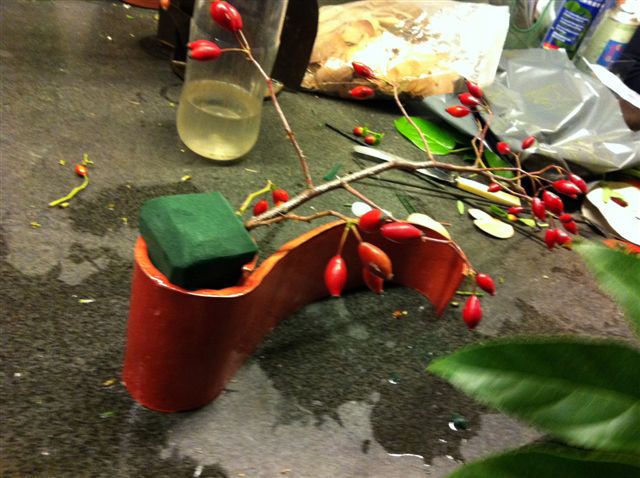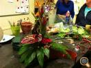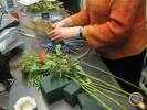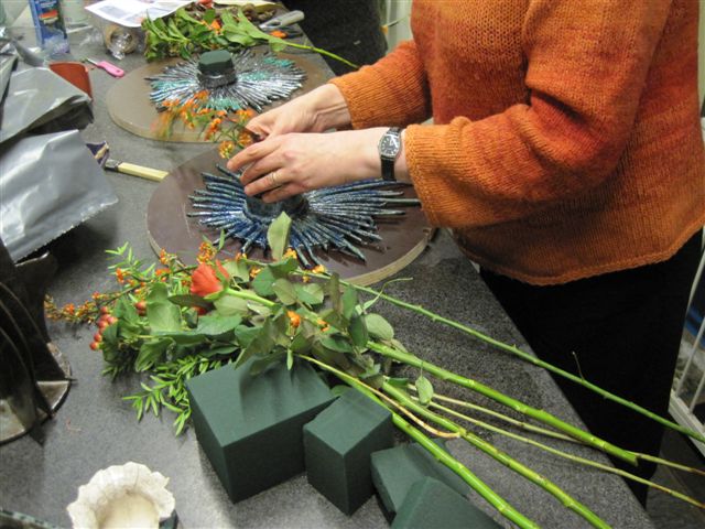 23 november was de dag, dat de cursisten een periode afsloten, waarin ze op een heel speciale manier invulling hadden gegeven aan het thema ‘bijzondere schalen en vazen’. Eigenlijk was er nauwelijks sprake van een schaal of een vaas, het waren bijna allemaal ‘objecten’ geworden, die door bloemsierkunstenares Monique de Kleijn uit ’s-Hertogenbosch in een workshop omgetoverd werden tot ‘bloem-objecten’. Het was geweldig om te zien hoe zij met eenvoudige materialen echte metamorfoses tot stand bracht.