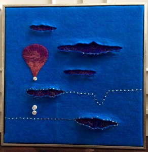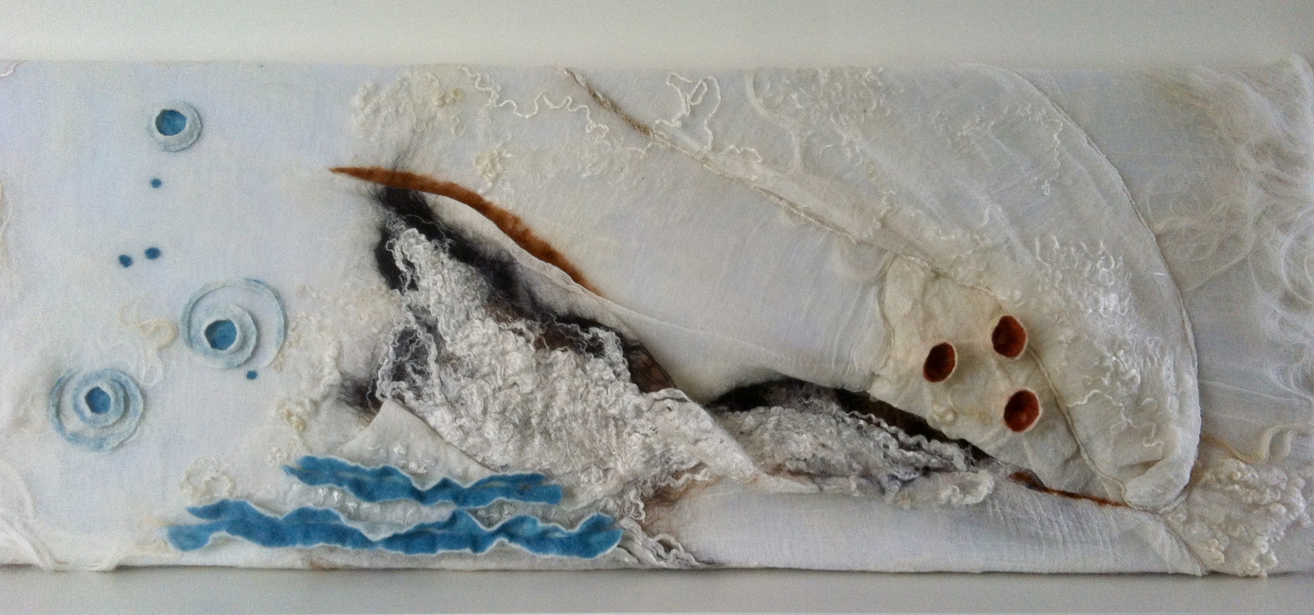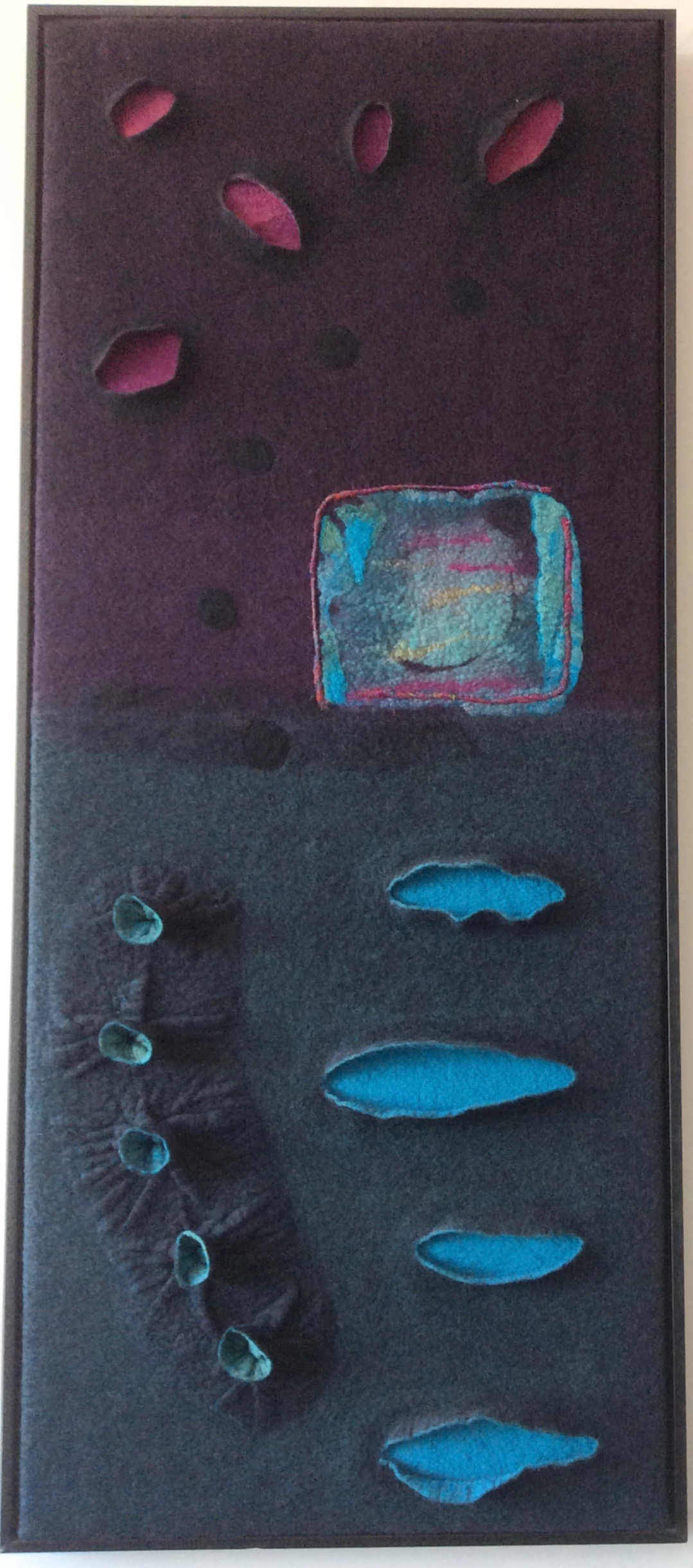 Als afwisseling speel ik zo nu en dan met kleurrijke doeken. Deze maak ik ook in lagen. Omdat deze lagen contrasteren in kleur kan ik, door in de bovenste laag openingen te laten, met die kleuren spelen. Daardoor krijgen ook deze doeken dieptewerking. Deze wandpanelen span ik meestal op en zet ze in een lijst. Zo maak ik verschil in strak en organisch werk.